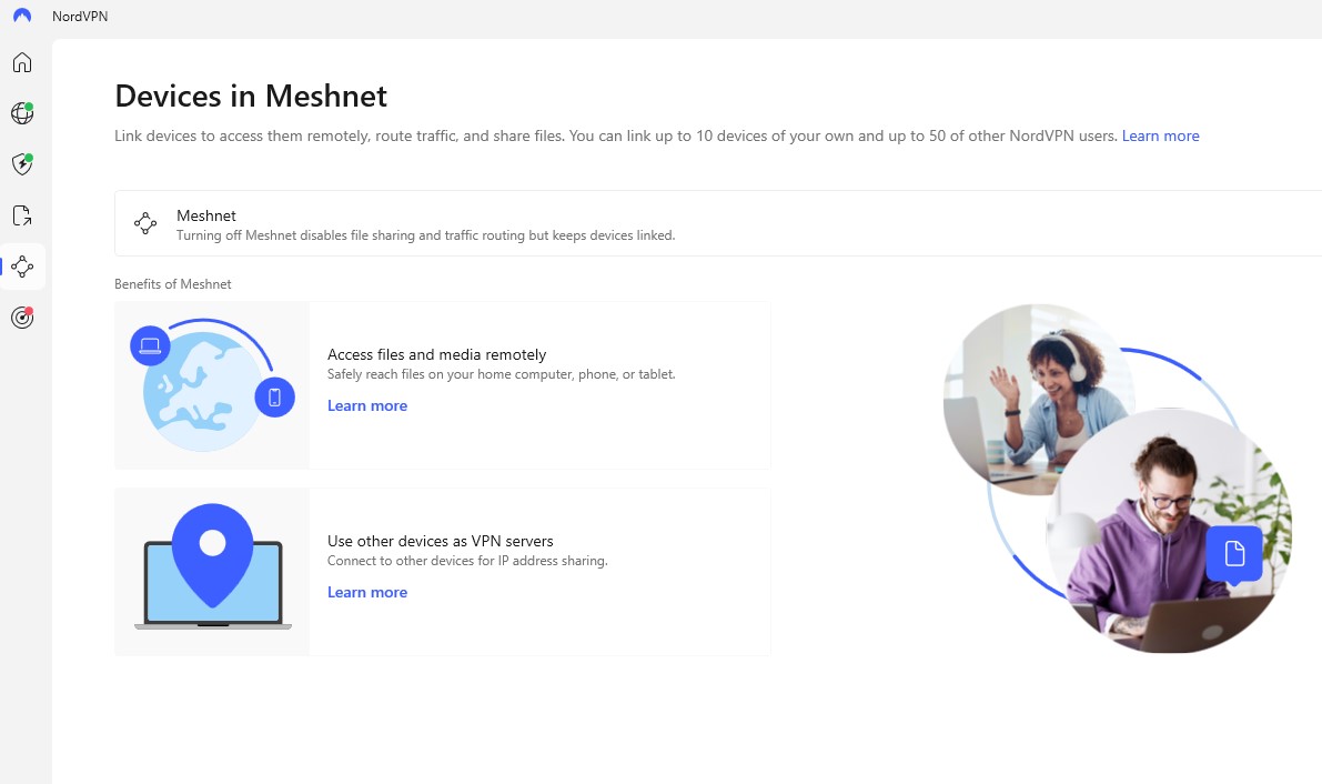 NordVPN’s Meshnet connects devices securely over a private network, functioning like a local area network (LAN). It allows file sharing, remote device access, collaborative work, and multiplayer gaming with high speed and security.