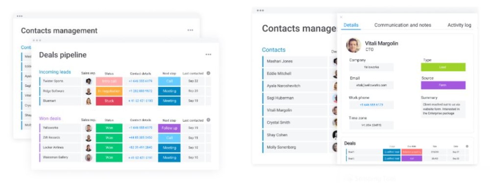 monday.com vous permet de gérer tous vos contacts professionnels en un seul endroit afin de ne manquer aucune piste et d’être au top en matière de ventes. Les cartes de contact offrent un contexte complet en affichant toutes les données liées au contact, telles que les tâches, les documents, les activités et les accords.