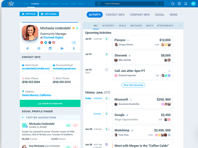 Nimble fournit tout ce dont vous avez besoin pour gérer vos contacts, atteindre vos objectifs, trouver des opportunités et construire des relations. Le Nimble Prospector vous permet d’accéder aux avantages partout, y compris sur les plateformes sociales, les applications de navigation web et les boîtes de réception.