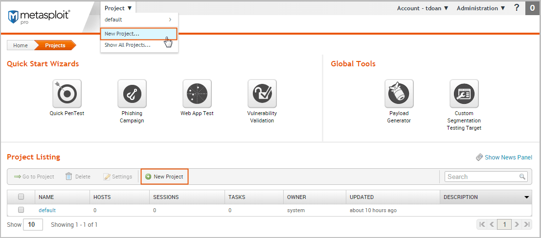 Démarrez un projet – Il s’agit de votre espace de stockage de données et de votre espace de travail. Comme vous pouvez avoir des exigences différentes pour les divers sous-réseaux de votre organisation, l’organisation de votre travail améliorera votre efficacité. Par exemple, si vous effectuez un test d’intrusion pour les équipes informatiques et les ressources humaines, vous voudrez générer des résultats distincts.