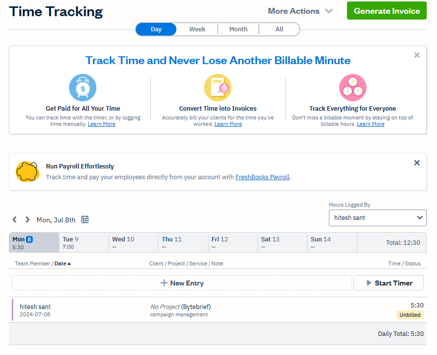 FreshBooks’s time tracker allows users to monitor individual employees’ work progress, helping managers track productivity and make project management decisions.