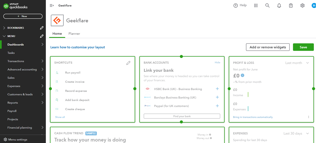 FreshBooks‘ interactive dashboards visually represent your financial data, making it easy to identify trends and patterns at a glance. You can create a personalized dashboard that aligns with your business goals with customizable widgets and charts.