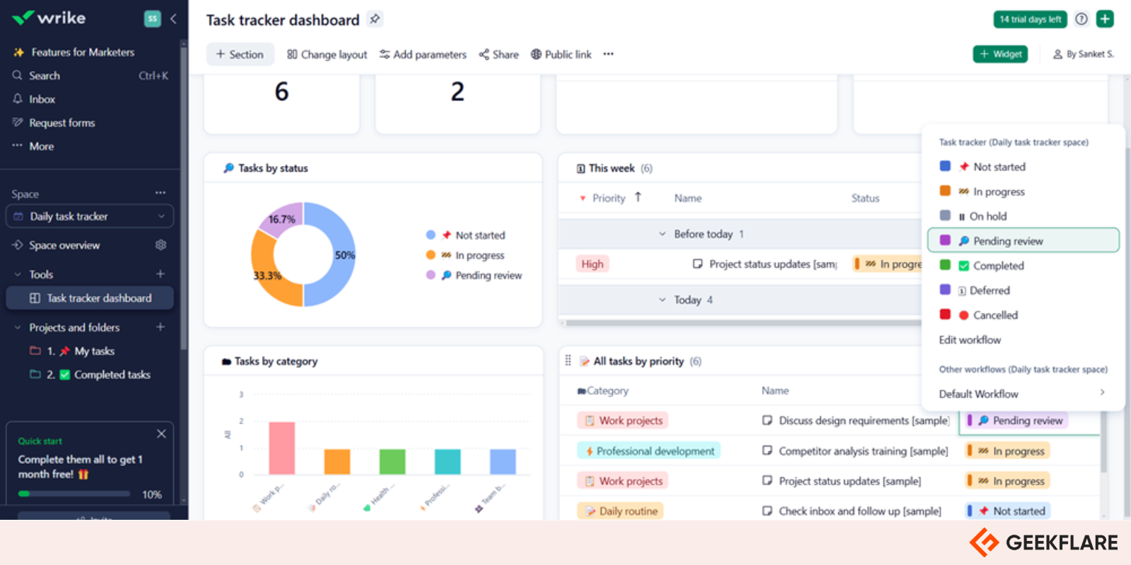 Wrike’s task tracker dashboard shown in the above image is designed to keep you on top of your projects with features like a priority-based task list and a visually engaging status indicator. Whether it’s “Not Started” or “Pending Review,” the clear color-coded labels and customizable workflows ensure you can tweak the tool to fit your team’s vibe and workflow.