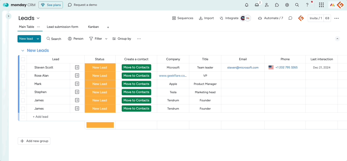 As I said, monday CRM offers a contact board by default. The board provides a consolidated view of your contacts. You can create and share dynamic forms and allow team members to submit contacts or bulk import your contact list from a spreadsheet.