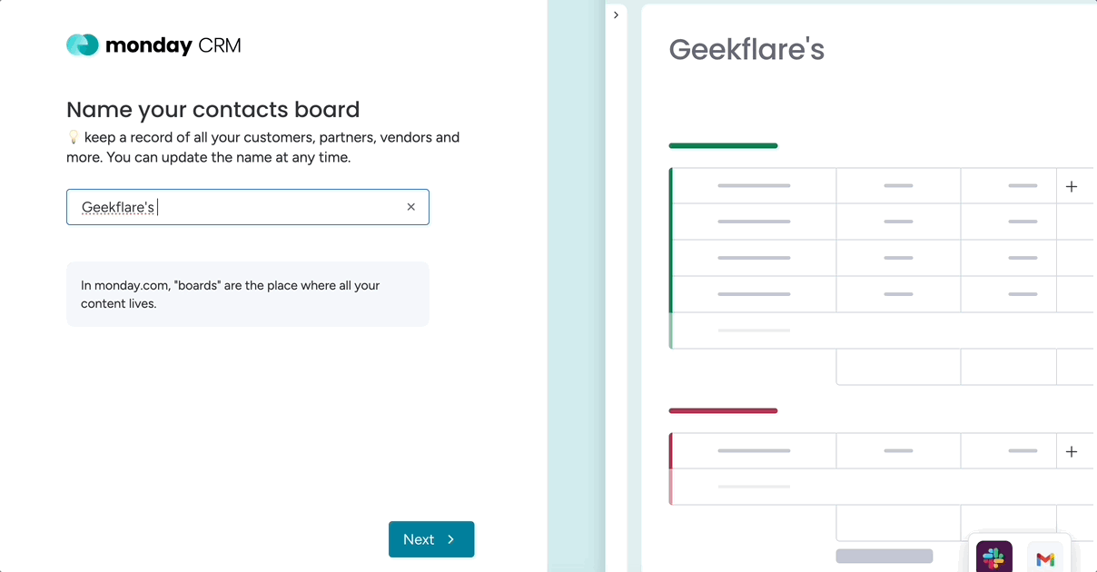 For example, if I add a contact with the email address “archit@geekflare.com”, monday CRM will search for the domain “Geekflare.com” on the Accounts board.