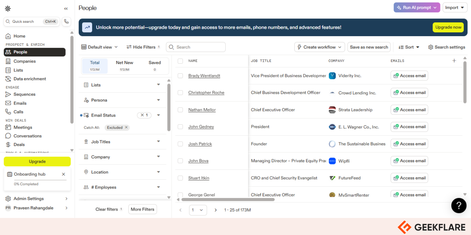 Geekflare tested Apollo by leveraging its AI-powered prospecting and engagement features, evaluating its lead enrichment, automation, and integrations. We assessed usability, data accuracy, and pricing, combining hands-on experience with user feedback for an unbiased review.