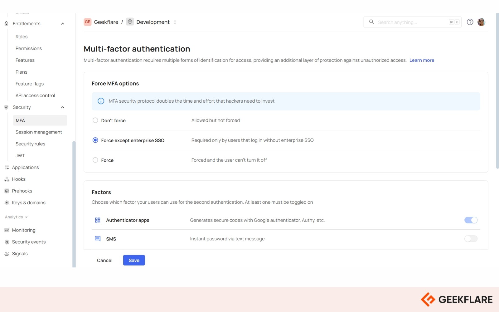 Forntegg also has some industry-leading attributes like forced MFA, user lockout, password change history, IP blocking, etc. In addition, you can apply Frontegg for machine-to-machine authorization. And finally, there is a facility to enable custom domains for cross-site authentication.