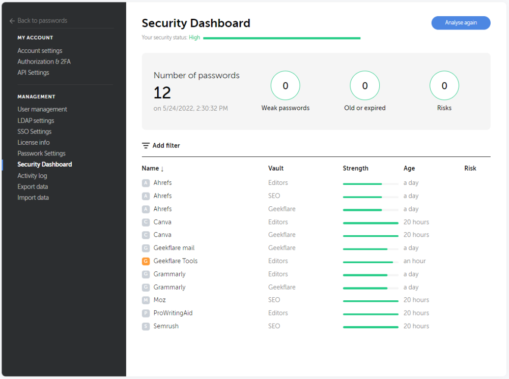 In a nutshell, this tells you about overall password security. You can check the password strength and age to reset it accordingly. In addition, Passwork automatically marks passwords that were accessed by employees who were removed from the system. This allows you to very quickly restrict access to corporate services to dismissed employees.