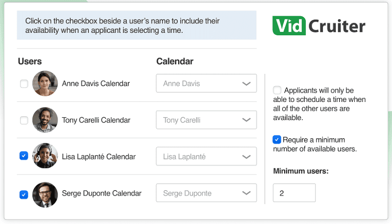 VidCruiter vous permet de partager vos disponibilités en temps réel directement avec les candidats afin qu’ils puissent choisir ce qui leur convient le mieux. VidCruiter est suffisamment flexible pour permettre aux candidats de choisir entre différentes options d’entretiens en personne ou virtuels.