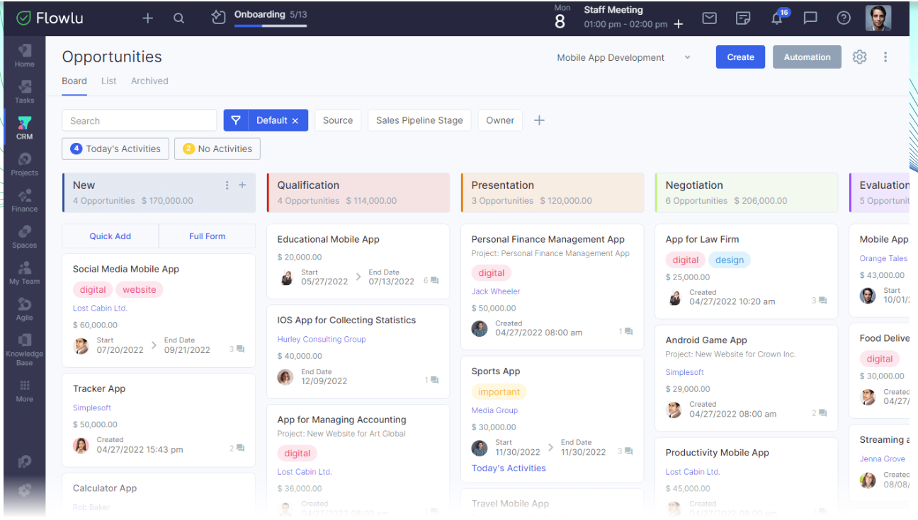 L’outil Flowlu CRM veille à ce que vos prospects soient correctement orientés vers un résultat probable de la planification des ventes. Vous pouvez rapidement suivre les nouvelles opportunités de vente, contrôler les opportunités de l’entreprise dans votre pipeline de vente et générer des leads de qualité.