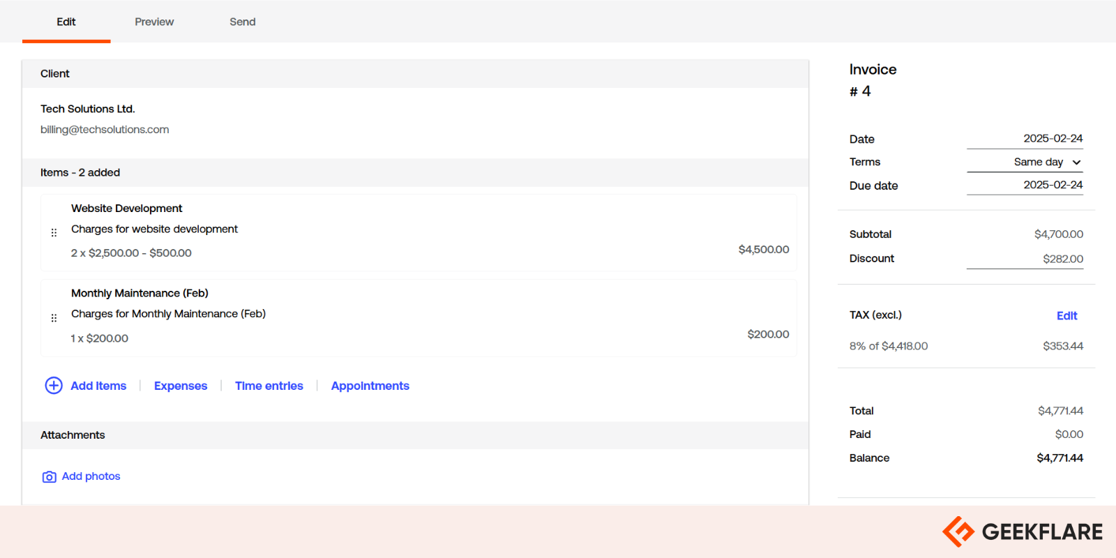 As you can see in the above screenshot, our team has created a sample invoice with the Geekflare logo and our brand color theme. Users can also request reviews by enabling the ‘Request Review’ option from clients, enhancing their business credibility while managing invoices efficiently.