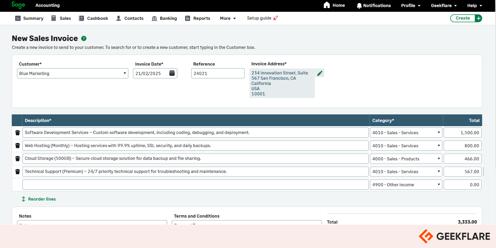 The top menu includes options like Summary, Sales, Cashbook, Contacts, Banking, and Reports, helping businesses manage financial transactions, customer relationships, and cash flow efficiently. The invoicing system supports categorizing line items under different sales or income types, enabling better financial tracking.