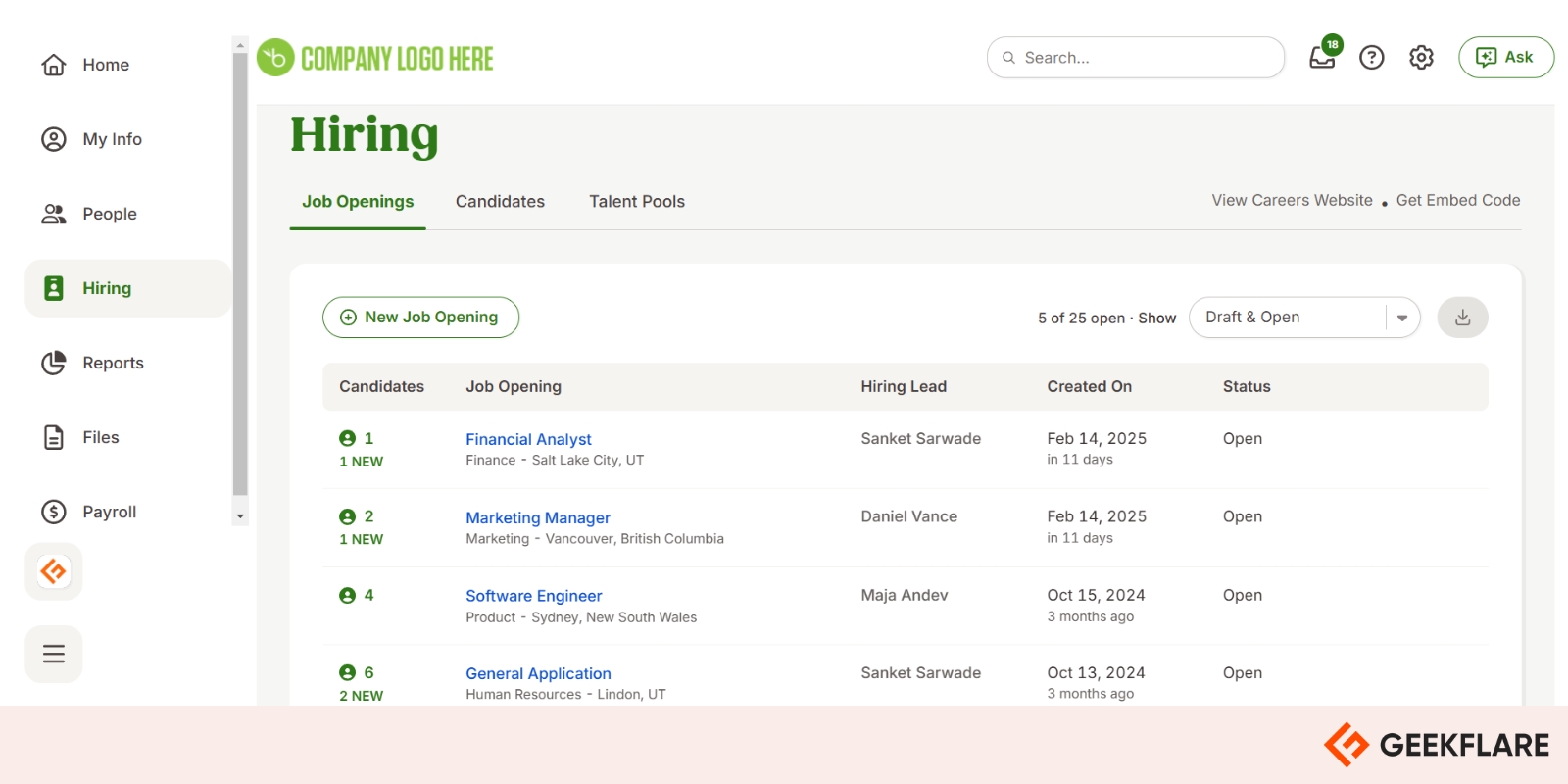 Like other talent acquisition platforms, Sage People’s Talent Acquisition module helps you secure the best talents in the market with its AI candidate matching feature. You can even run payroll for US and UK employees from the same platform using its integrated payroll solution that seamlessly connects with HR. Hence, there is less chance of data error and complete elimination of manual data entry.