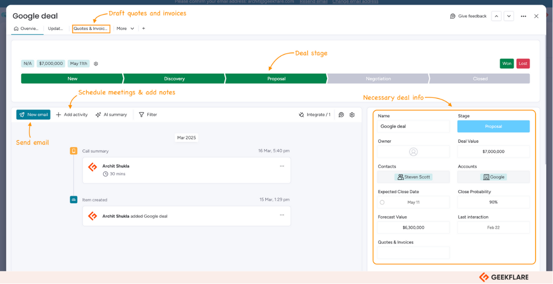 Next, if I open any deal card, I get a holistic overview of my deal. For example, with every deal card, I can:
